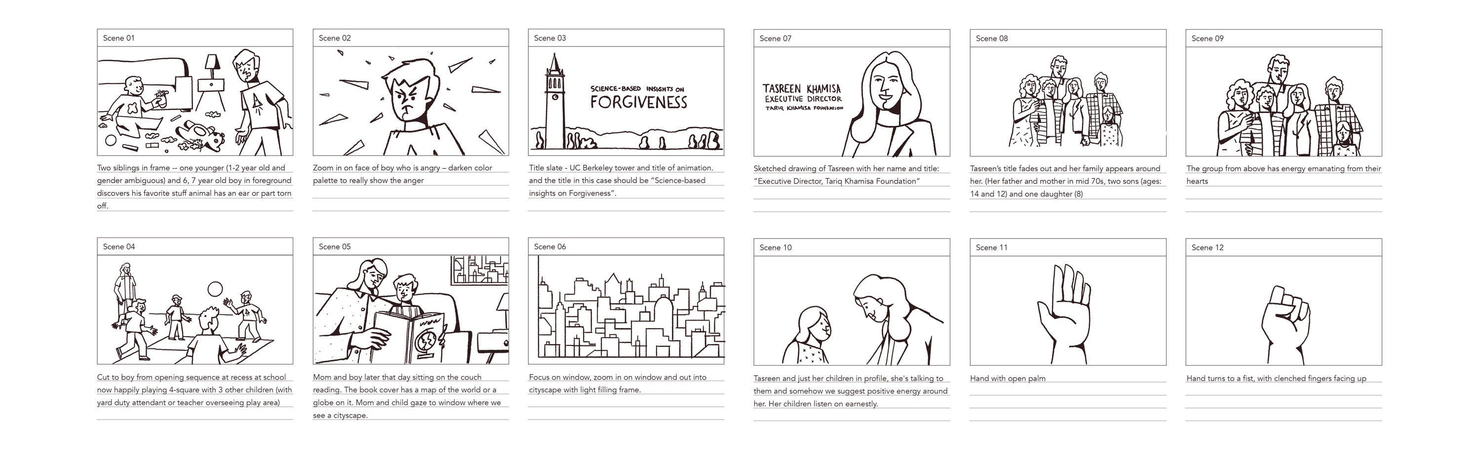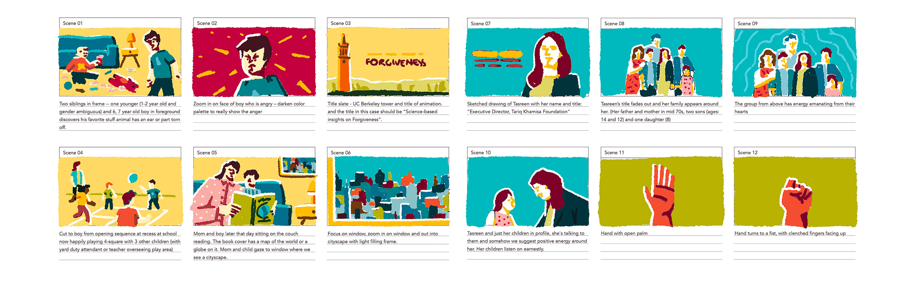Storyboard and illustrations for the "Science-based insights on Forgiveness" short animation developed for the Greater Good Science Center and Berkeley University. The animation aims to help kids understand forgiveness.